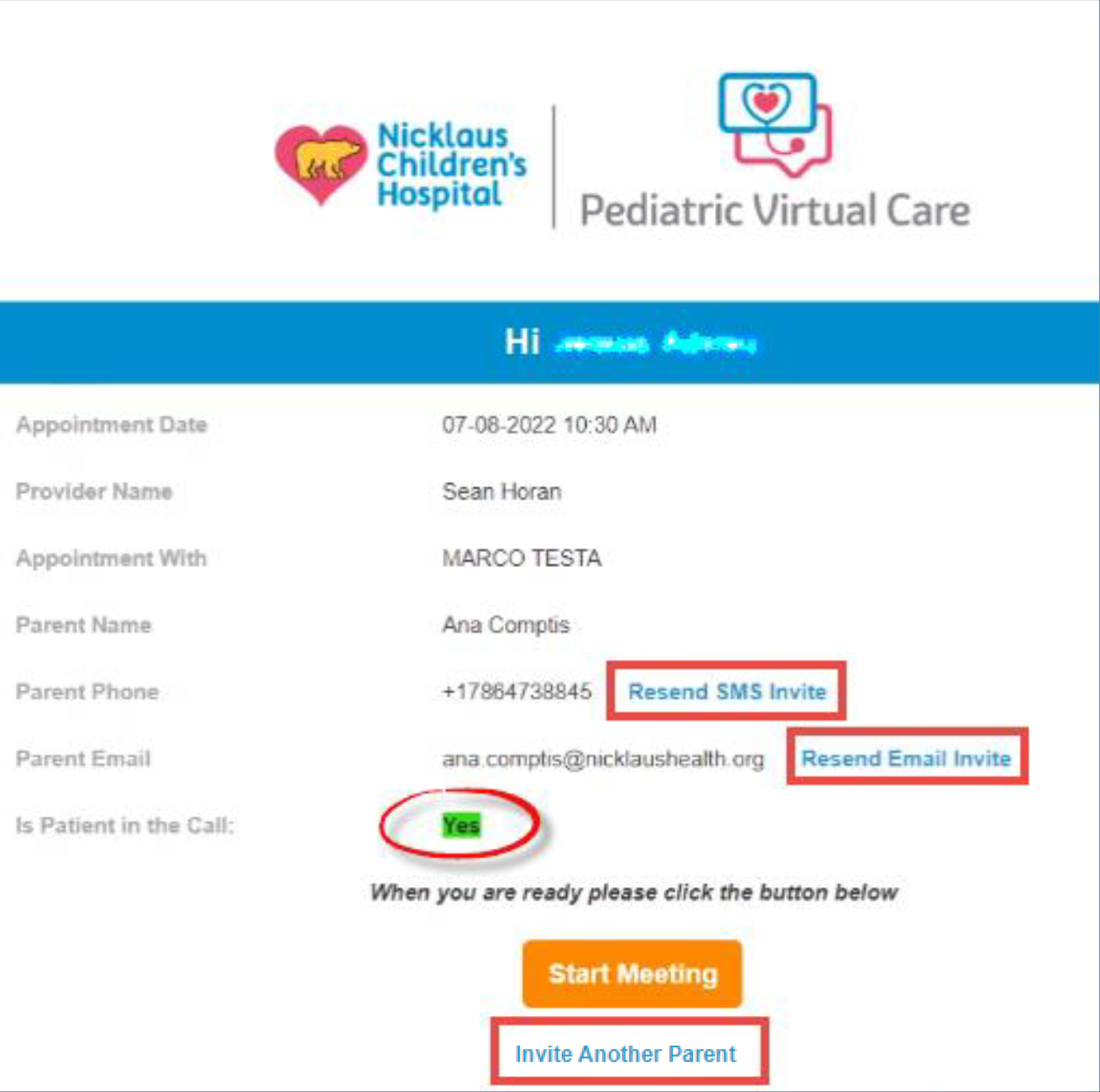 From the original Nicklaus Children's Pediatric Virtual Care Telehealth window, where the call was