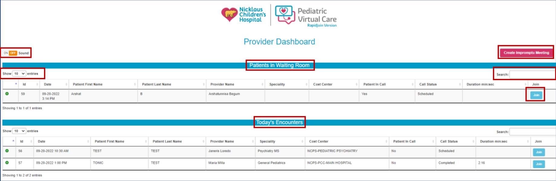 two sections, the Patients in Waiting Room and Today's Encounters.